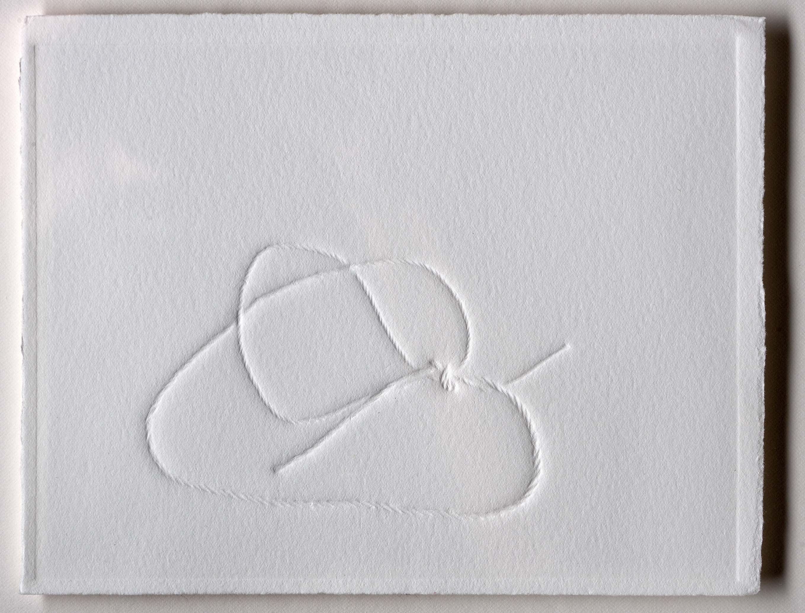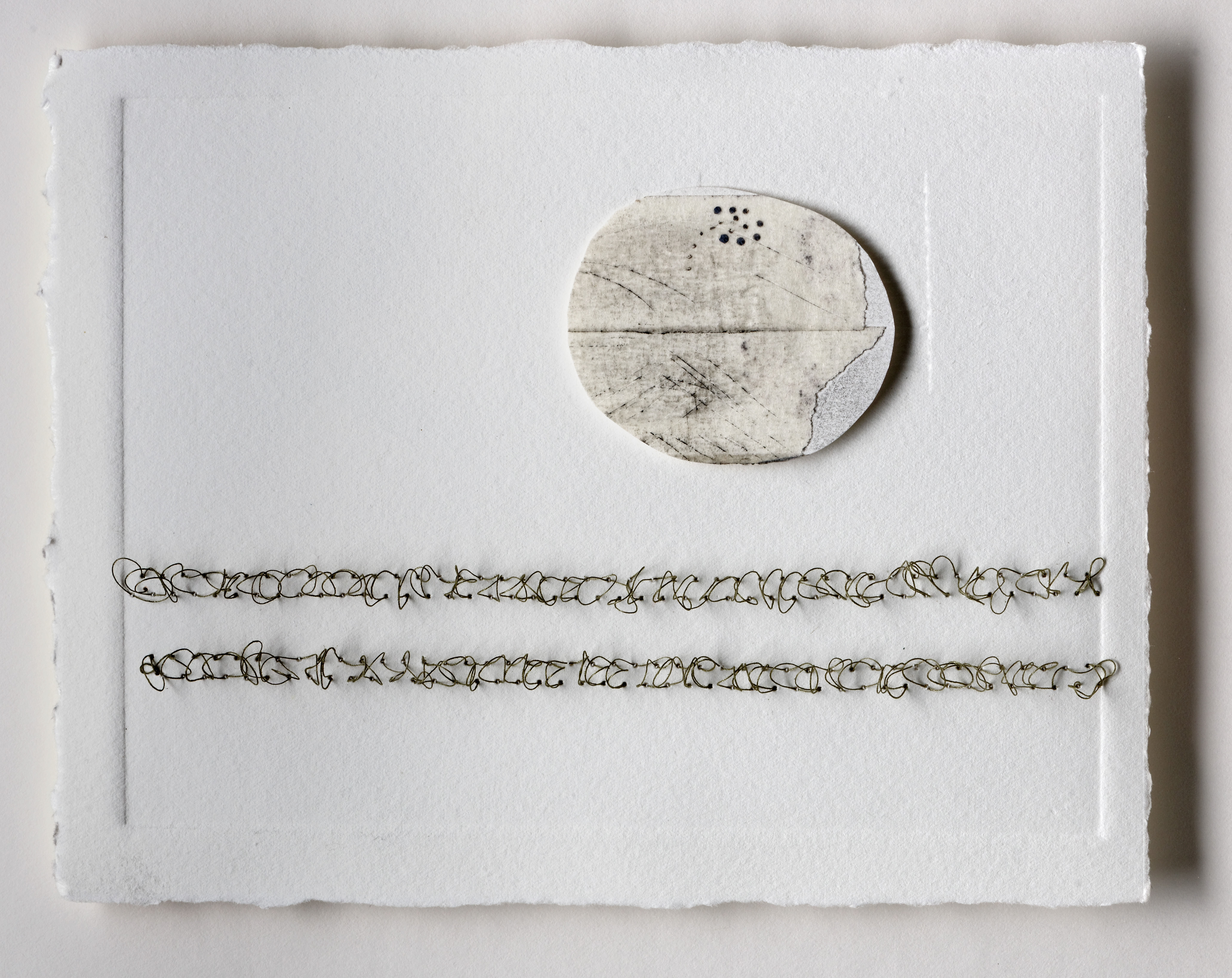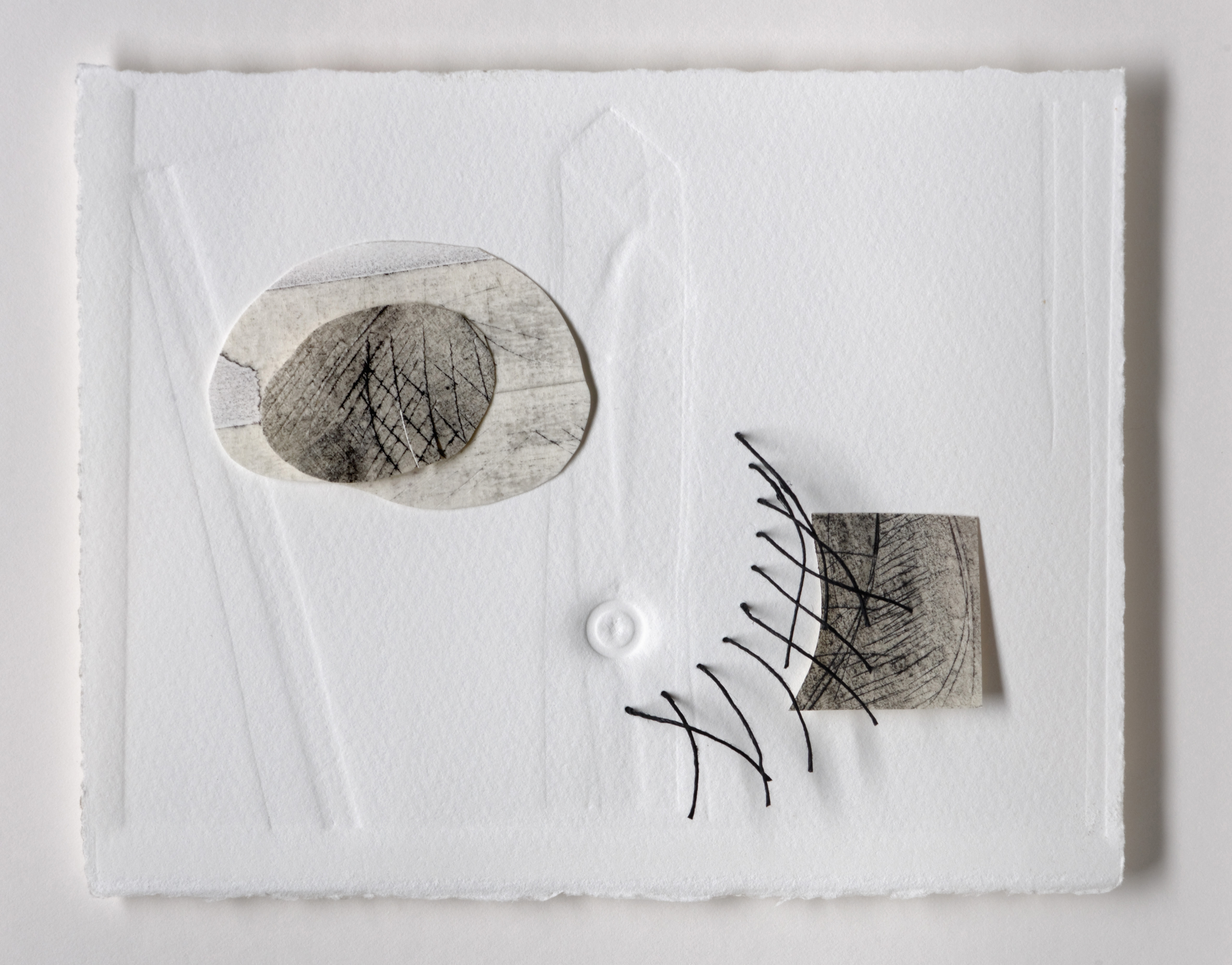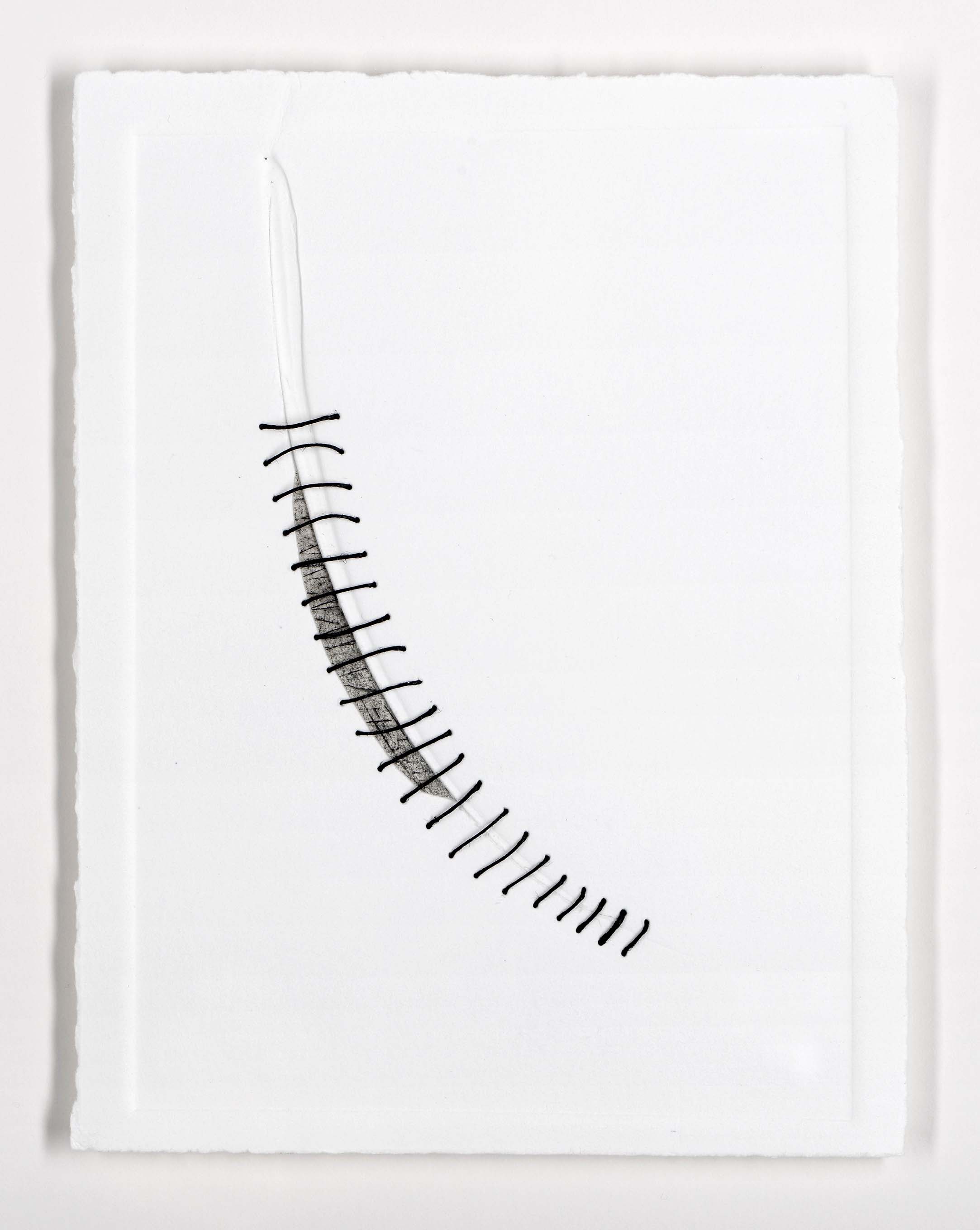 Gentle as silence 2015/16 Debossed somerset paper, linen thread, graphite This is representative of a set of 14 pieces evoked by 14 days pilgrimage. Each 31cm X 28cm framed.