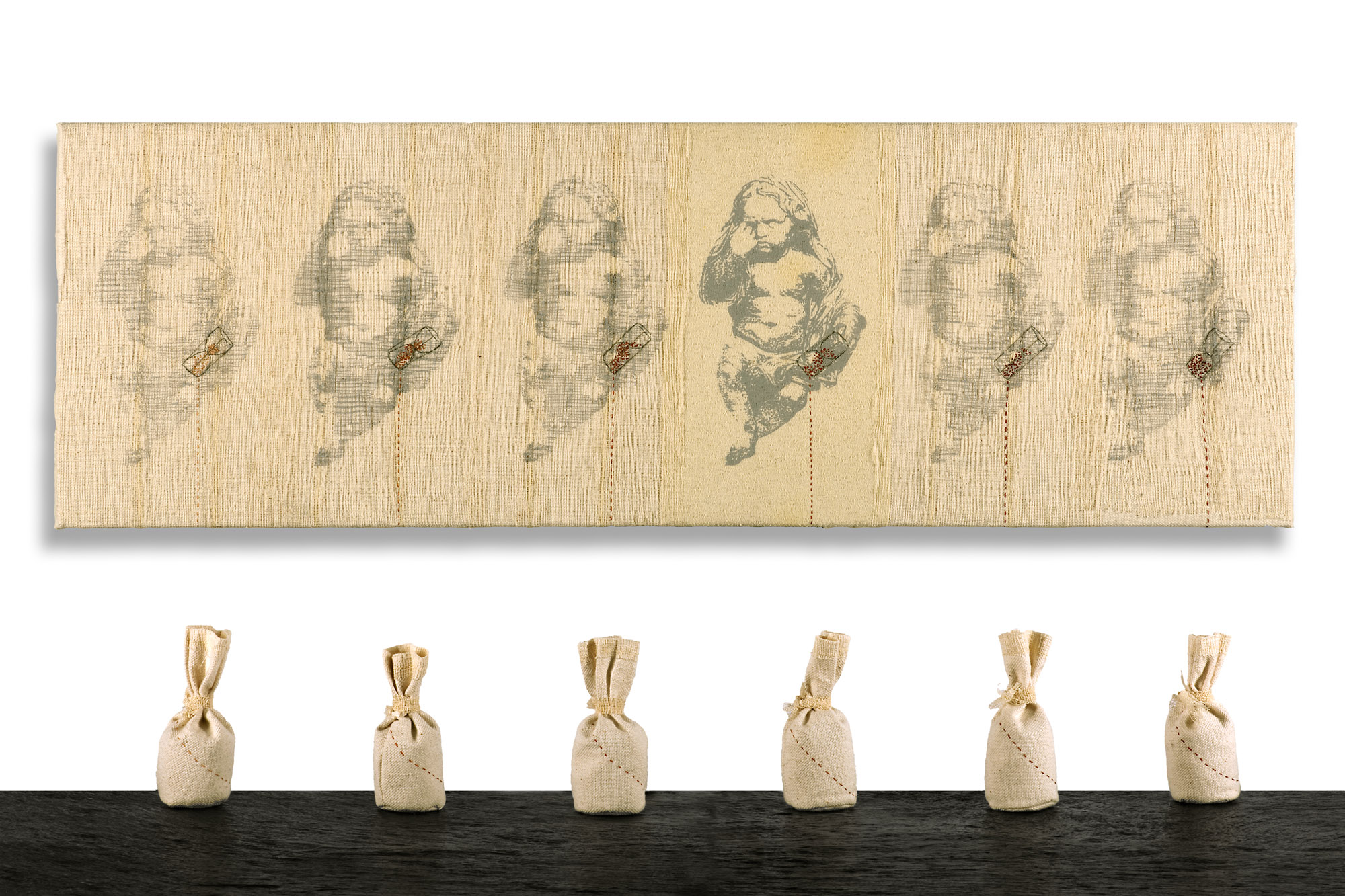 Sadness, sand and time pour out and fill the bags.