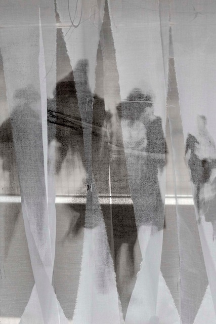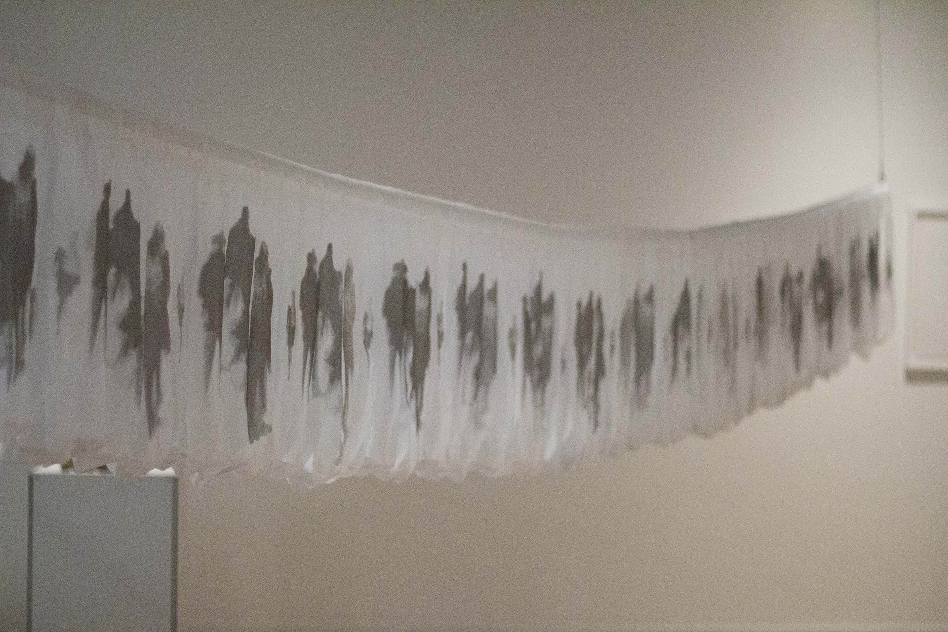 Each screen printed piece measures the length of a stride and the number of strides taken in a minute. Each continuous mobius strip is weighted and stitched with a reason for displacement and causes the installation to move when you walk by it.